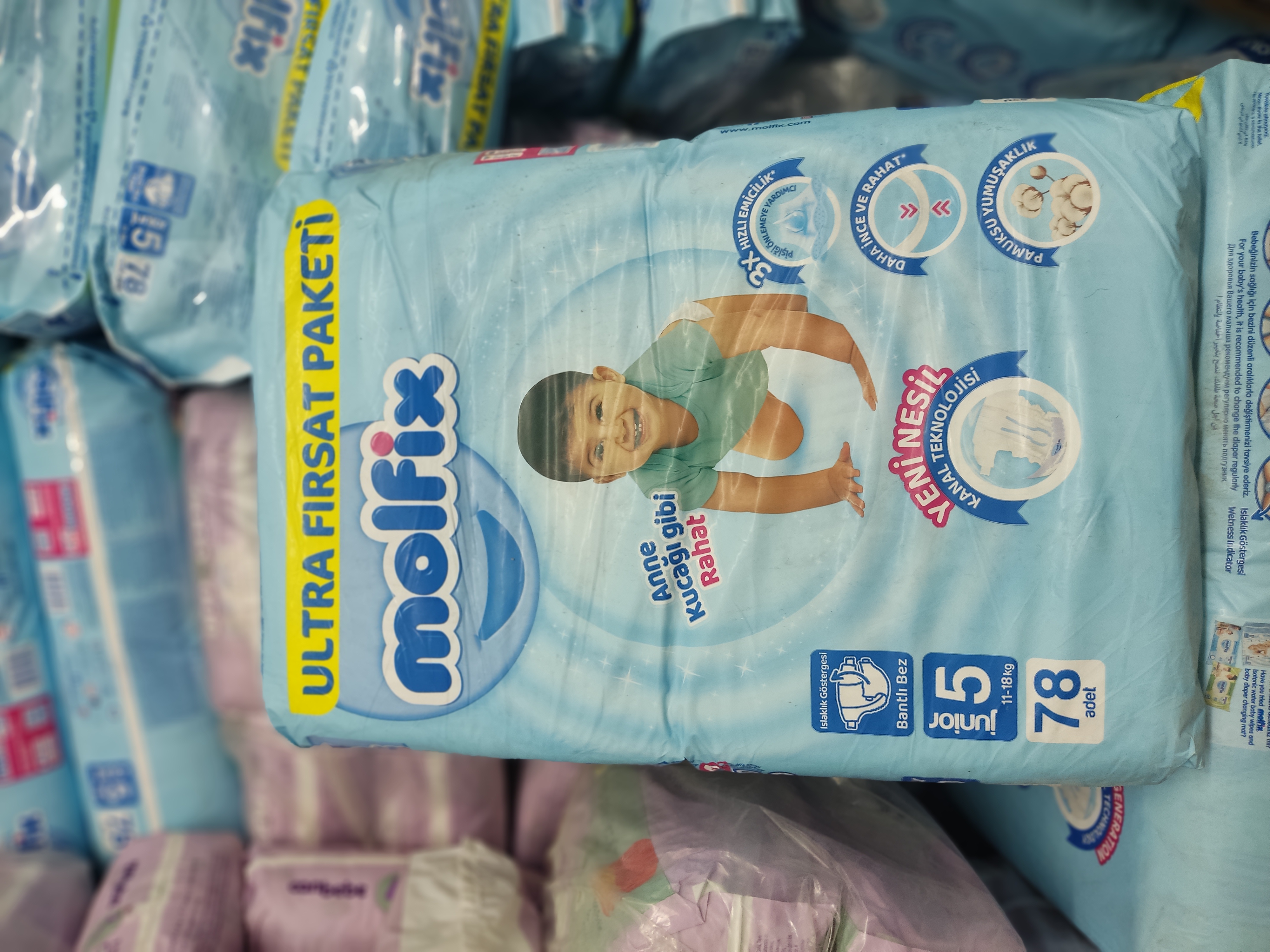 پوشک بچه مولفیکس ترکیه سایز 5 بسته ۷۸ عددی مناسب کودکان با وزن 11 تا 25 کیلوگرم دارای ساختار آناتومیک کفیت و راحتی بسیار بالا ضد حساسیت کشور سازنده : ترکیه