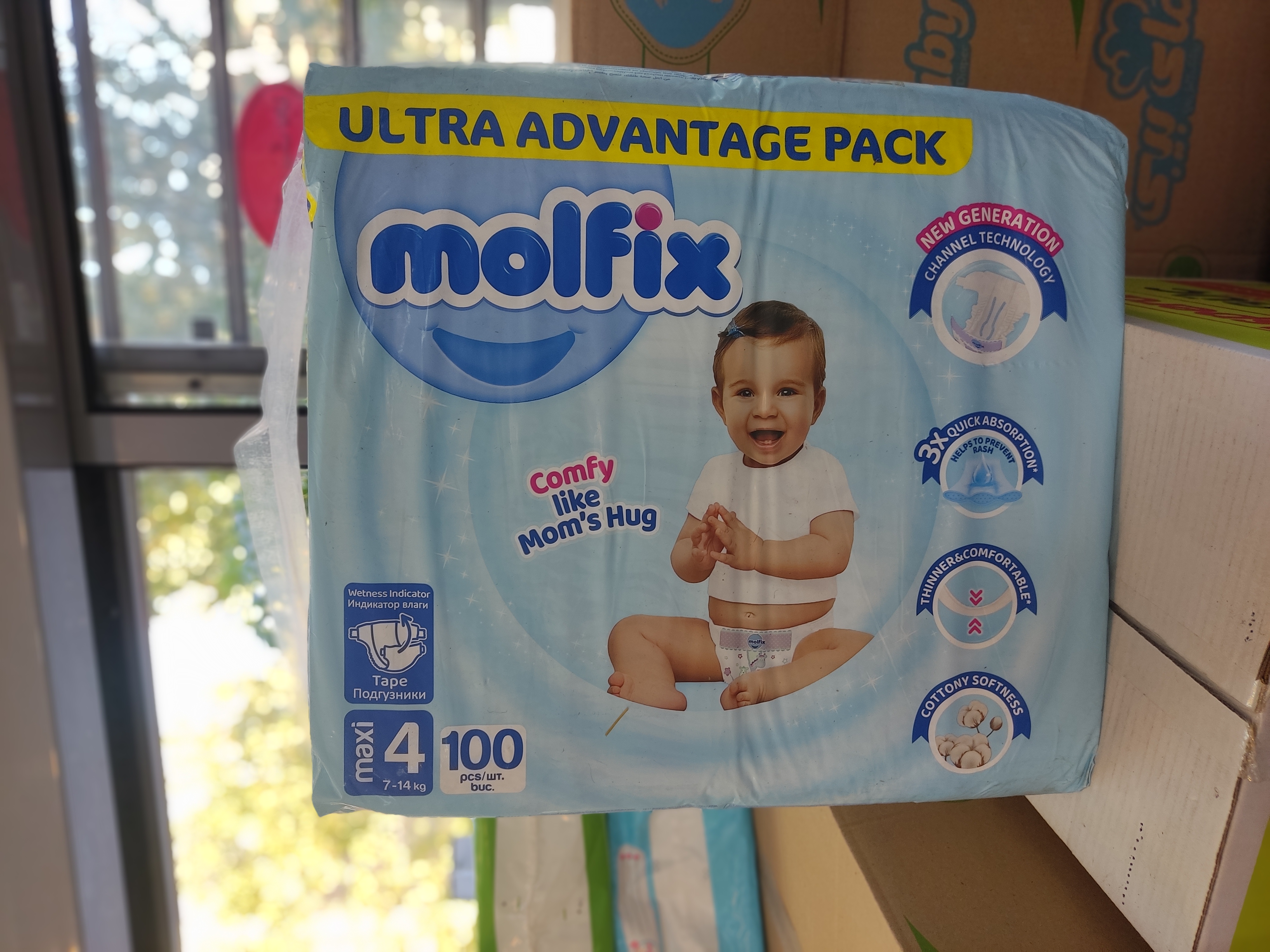 پوشک بچه مولفیکس ترکیه سایز 4 بسته ۱۰۰ عددی مناسب کودکان با وزن 7تا 18 کیلوگرم دارای ساختار آناتومیک کفیت و راحتی بسیار بالا ضد حساسیت کشور سازنده : ترکیه
